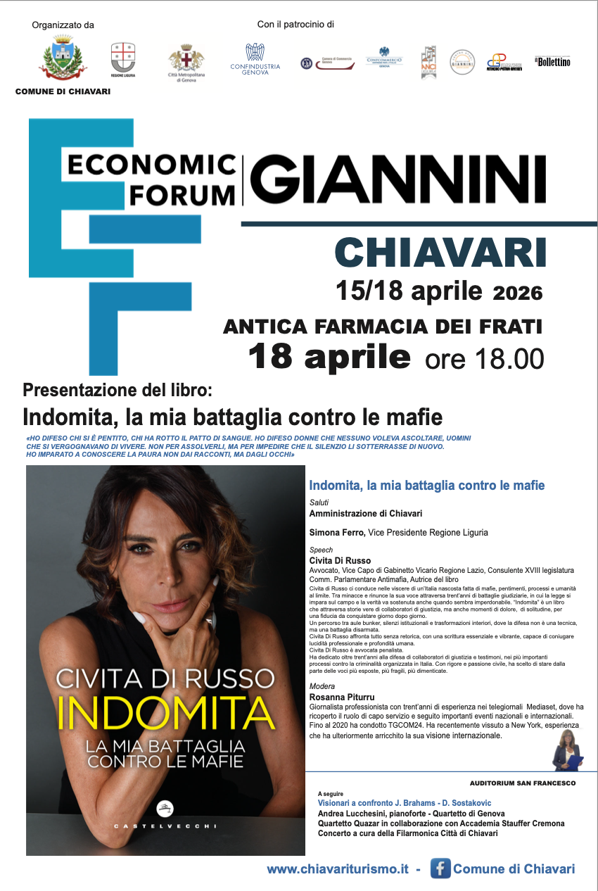 Sabato 18 aprile alle ore 18, presso l’Antica Farmacia dei Frati, nell’ambito dell’Economic Forum Giannini, si terrà la presentazione del libro Indomita. La mia battaglia contro le mafie di Civita Di Russo.